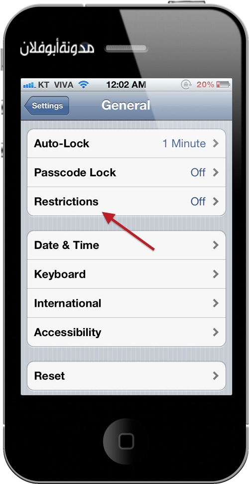 ماعليك الا الدخول الى Setting ثم Restrictions ثم الضغط على Enable وتعيين رقم سري حتى تستطيع تعطيل الخاصية فيما بعد