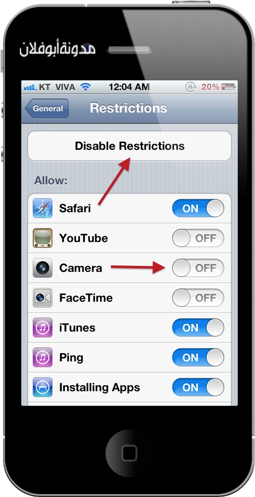 شركة أبل قامت بتوفير خاصة تسمى ” القيود ” أو Restrictions تستطيع من خلالها ازالة خاصية التصوير او تعطيل بعض الأوامر