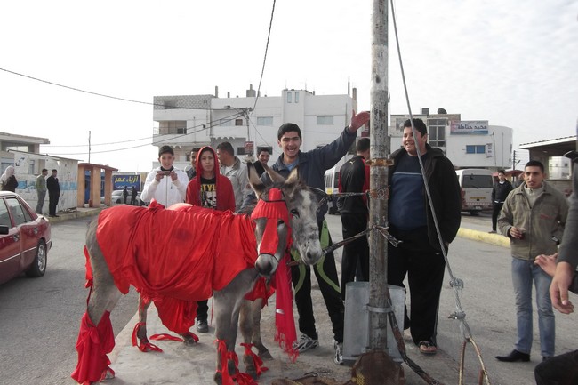 لكن شباب منطقة الرمثا في الأردن يحتفلون به بطريقة أخرى حيث لم يستطع صاحب الحمار أن يتركه وحيدا حزينا في هذا اليوم فقام بالباسه اللباس الأحمر ووضع معه بوكيه ورد وقرّب له حماره أخرى لتحتفل معه 🙂