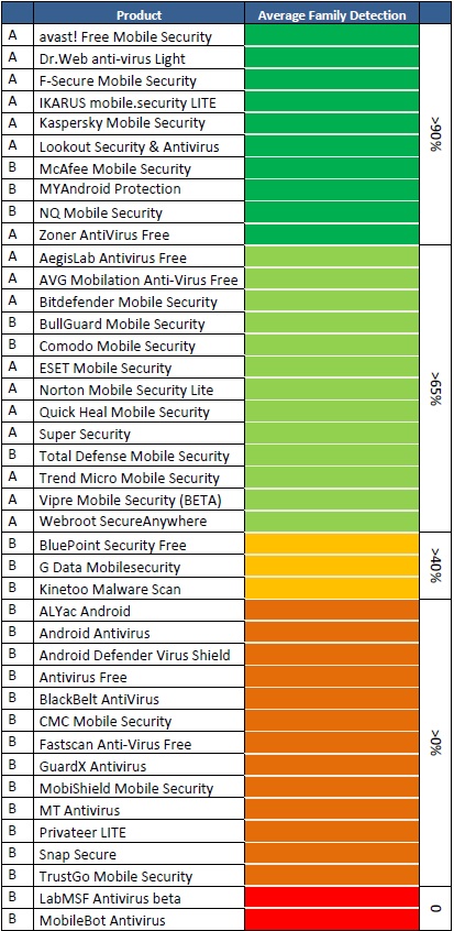 قامت شركة AV-Test للحلول الأمنية بعمل فحص شامل لكل برامج الأنتي فايروس والأنتي مالوير لأجهزة الأندرويد على 618 فايروس منتشر ومدموج في برامج مخادعه ، حيث قامت بإختبار 41 برنامج حماية مشتهر في الأندرويد ماركت ( قوقل بلاي ) حاليا ، وكانت النتيجة كالتالي :
