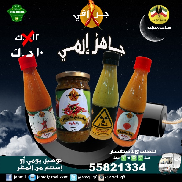 وصلتني مجموعة من الصلصات النارية والمعبوج الكويتي من مشروع جراقي الذي يعمل على توفير اربع انواع من الفلفل لاستخدامه مع مختلف الأطعمه مثل المجابيس والسندويتشات والبطاط والباستا وغيره